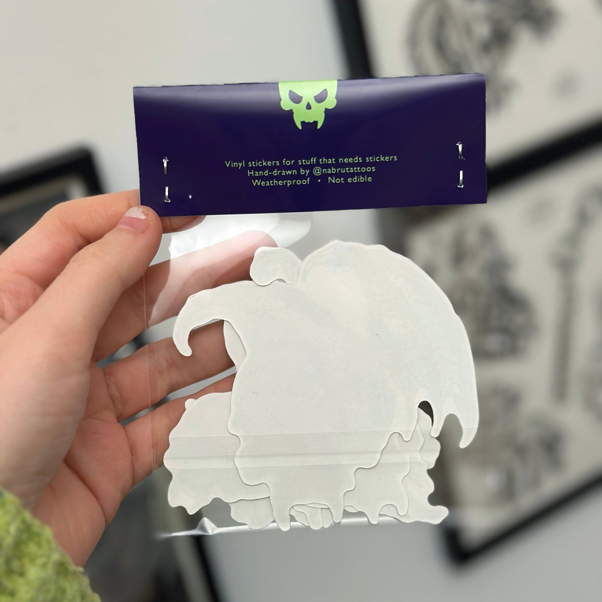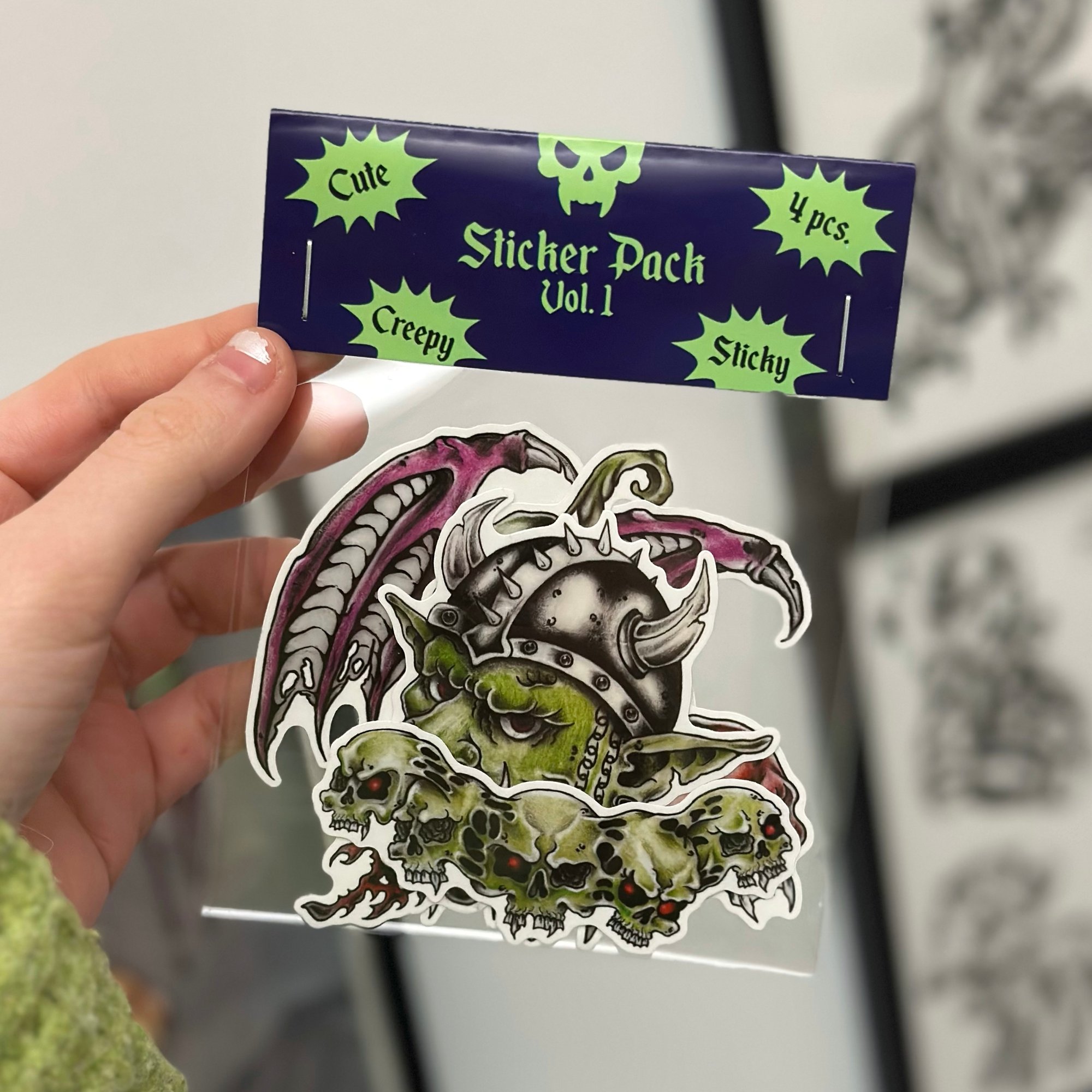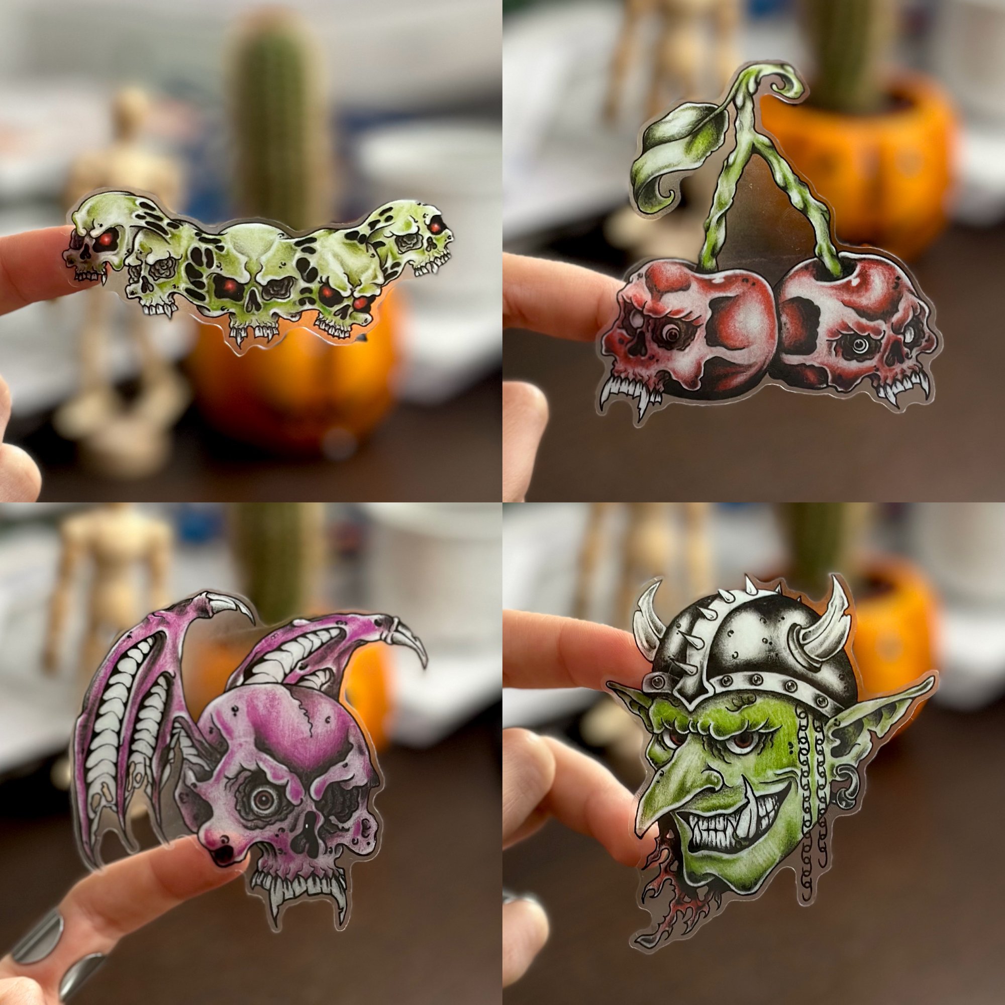 Sticker pack with 4 original hand-drawn designs printed on transparent, weatherproof vinyl.